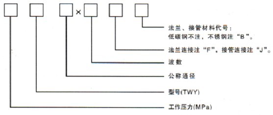 舉例:0.6TNY500TF 表示:公稱通徑為Φ500,工作壓力為0.6MPa,(6kg/cm2)波數(shù)為4個(gè),帶導(dǎo)流筒,碳鋼法蘭連接的內(nèi)壓式波紋補(bǔ)償器。